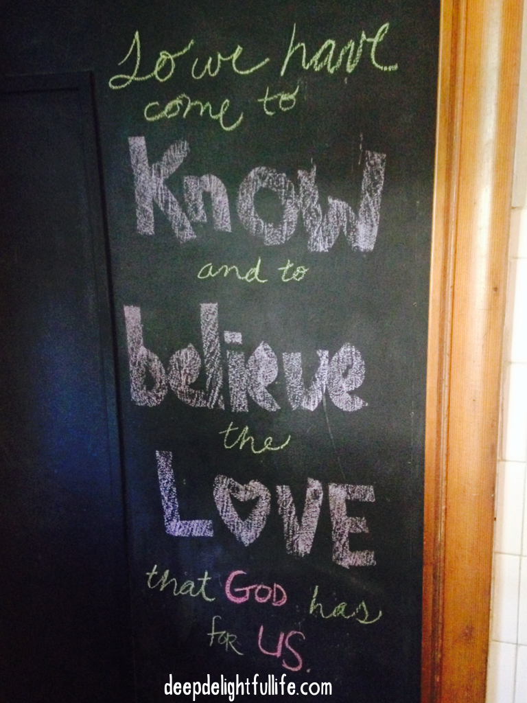 Verse 7 reminds me that because of the goodness (love-mercy-justice-holiness-light-etc.) of God, I can and will walk in the light and continue to work out my salvation with help from his Spirit. God’s pure, powerful light is greater than, and casts out, my darkness. But it’s not only about me, and I just love how this verse is constructed because the author mentions our fellowship with one another even before he mentions our being cleansed from sin. It is a super big deal to be in fellowship with one another, and that’s something else I want to remember this week. My salvation does not exist in an anti-social bubble (as much as that bubble sometimes sounds like a nice place to be), and it does not only redeem my connection to God, but my connection to others. I can be vulnerable and share my struggles with others. I can grieve with and give support to others who are going through hard times. I can ask for and give grace. I can share my triumphs and rejoice with others in times of joy and victory. This is all part of walking in the light.
