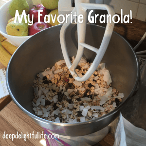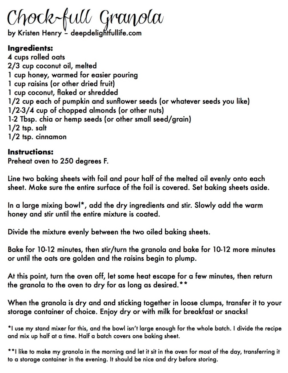 Fast forward to the trenches of my life on a gluten-free/egg-free/etc-free diet (and my husband’s life being reunited with his honey-bunches). I had been eating oatmeal every morning for years, and it didn’t bother me at all… until I couldn’t have anything else, and then it super did bother me! I remembered the granola recipe and came back to it, and have been working on it ever since. Lately I’m eating it every morning, only going back to good old cooked oats when I run out of granola and haven’t yet convinced myself to make more.